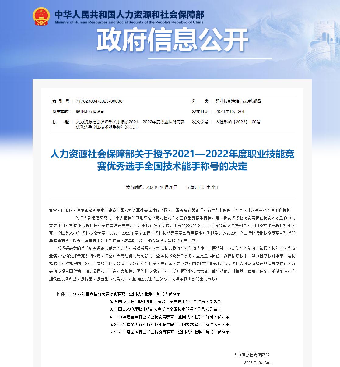 10月20日,人力资源社会保障部发布了《关于授予2021-2022年度职业技能竞赛优秀选手全国技术能手称号的决定》(人社部函〔2023〕106号),向在职业技能竞赛中取得优异成绩的选手授予“全国技术能手”称号 羞羞视频APP苹果下载,颁发奖章,奖牌和荣誉证书,我校模具设计与制造高水平专业群教师刘俊英和谢智阳于2021年12月参加了全国电子信息行业新技术应用职业技能竞赛,获得一等奖,被授予“全国技术能手”荣誉称号,实现我校在该领域零的突破。